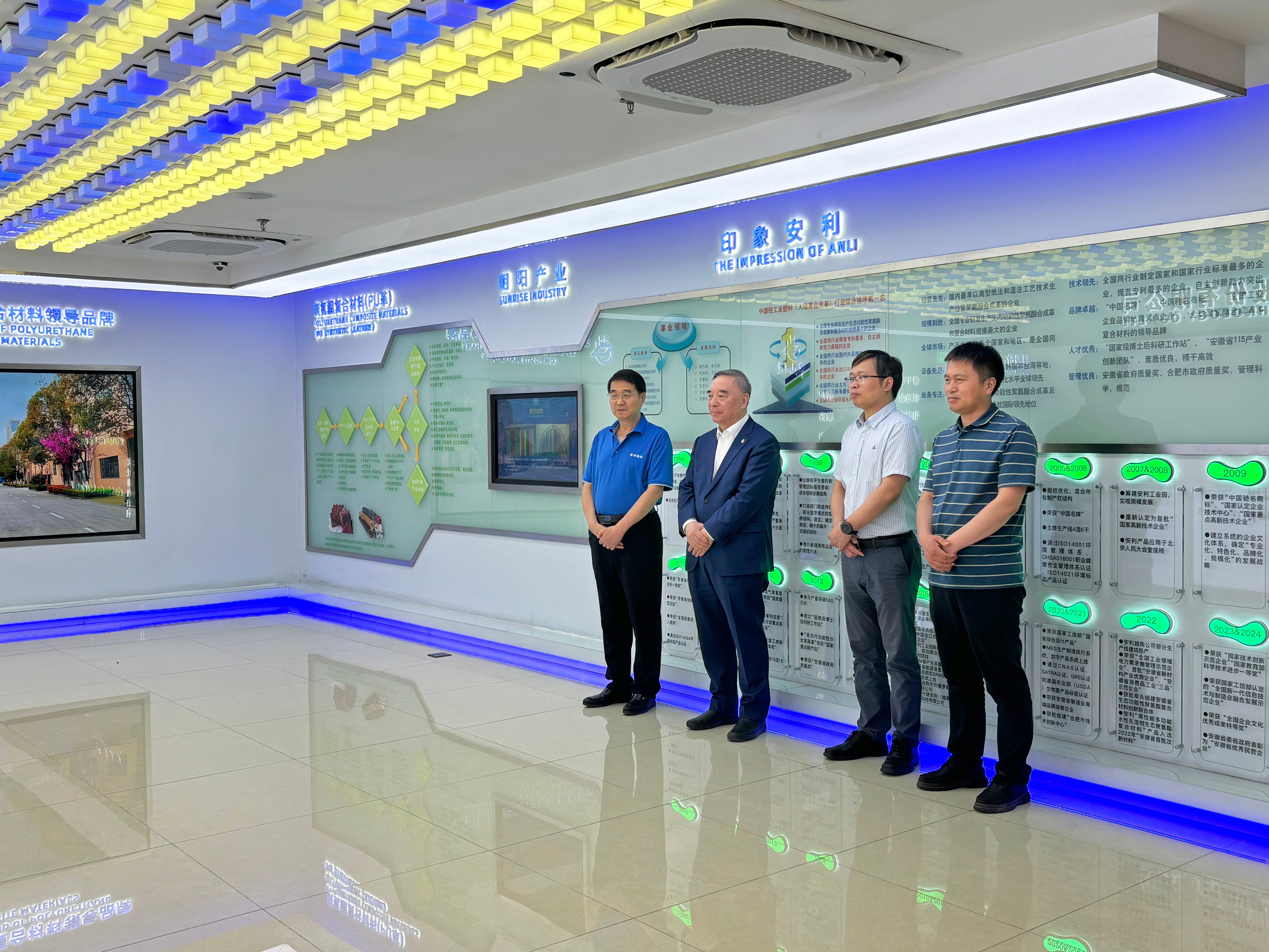 在产品展厅,琳琅满目的聚氨酯复合材料样品和产品实物有序陈列。公司产品在消费电子、汽车内饰等领域的高端应用成果,吸引了众人目光。宋志平会长对安利股份在材料科技领域的深厚积累与创新活力,表示充分肯定和高度认可。