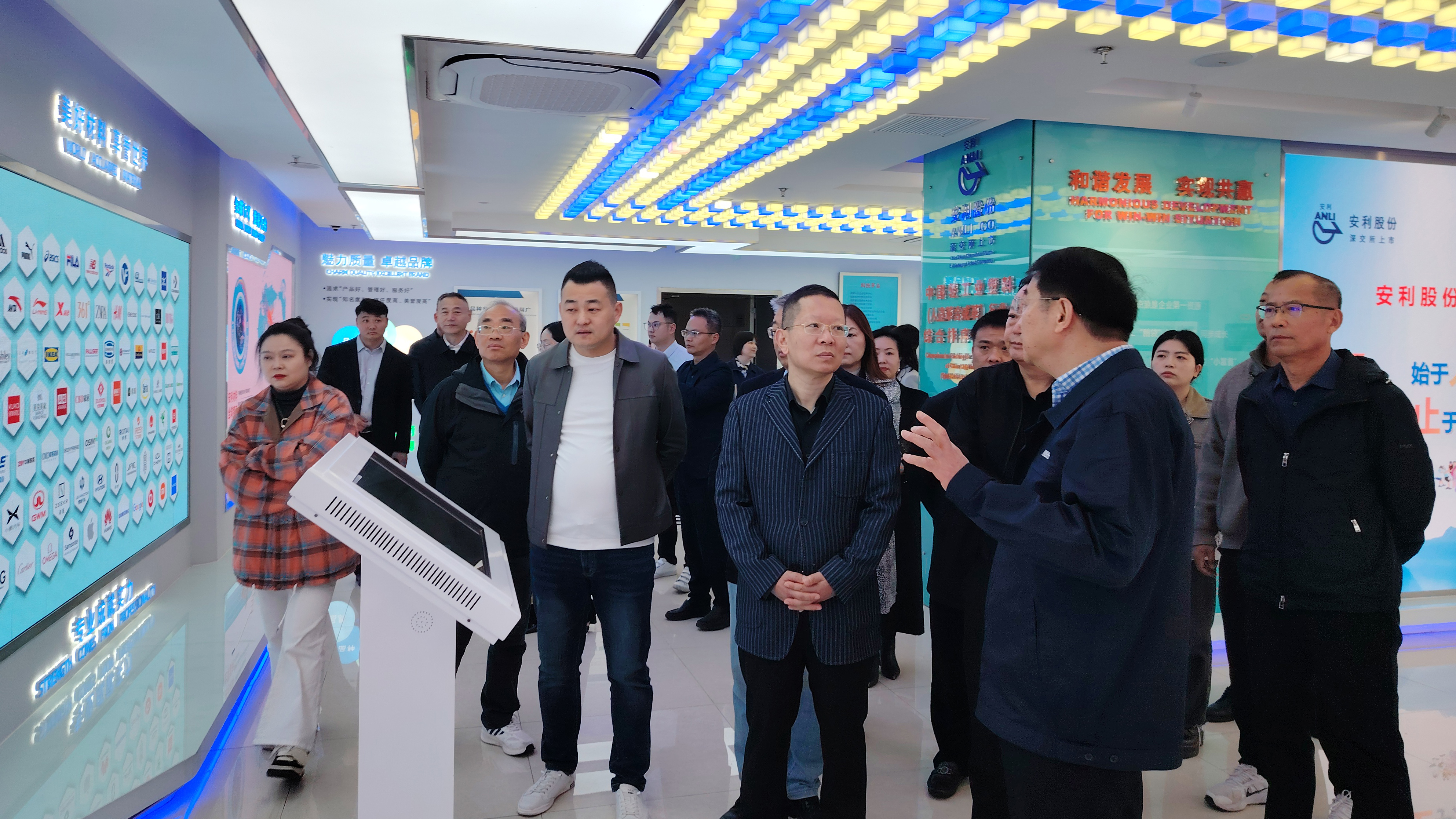 鲍小春总经理一行首先参观了安利股份研发中心,近距离观察安利股份的研发场景与技术成果。来到展厅,颜值与质感兼具的生态功能性复合材料陈列有序,耐克、阿迪达斯、彪马、安踏、亚瑟士、丰田、比亚迪、鸿蒙智行、顾家、宜家、芝华士、苹果、华为等国内外知名品牌的合作案例直观呈现,使企业家们深刻感受到了“安利材料,全球都用”这句话的内涵。