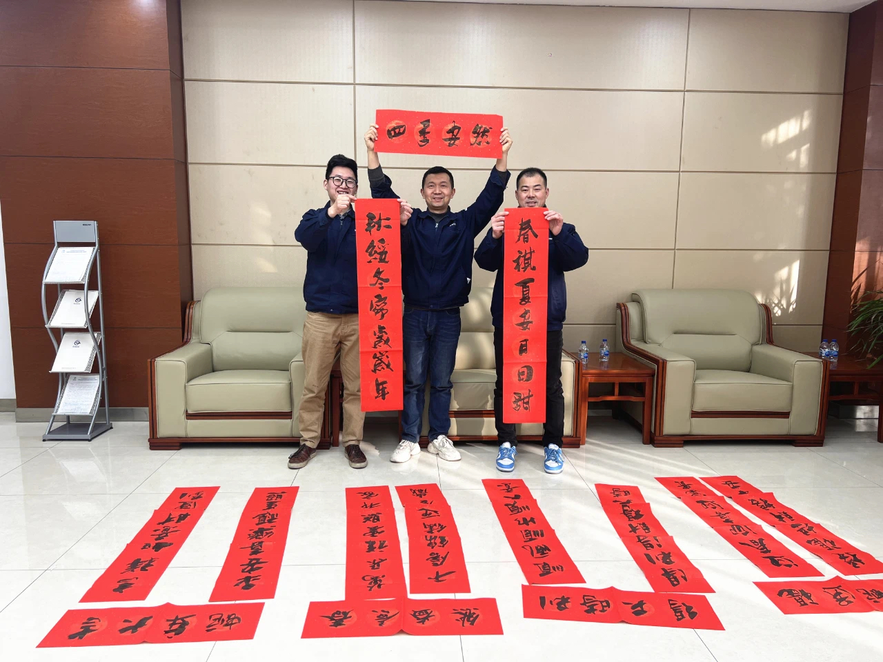 一个多小时的活动,书画家们笔不停歇,共为安利员工创作了一百多副春联。活动现场,随处可见桌上铺着的春联,员工手里拿着的春联,大家手捧散满墨香的春联,喜悦之情溢于言表。