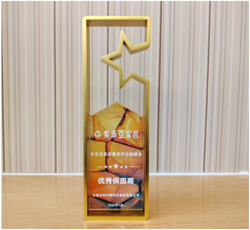 安利股份(300218.SZ)与索菲亚家居自2022年开展合作以来,始终把产品品质和生态环保放在首位,从技术开发、生产过程到品质管控进行全面管控,为索菲亚家居提供时尚流行、质感优良、功能出众、生态环保的优质产品。公司获得“优秀供应商奖”,是索菲亚家居对安利股份(300218.SZ)在产品品质、产品创新、订单交付以及服务质量等方面的高度认可,体现了安利股份优秀的品质实力和综合竞争力。