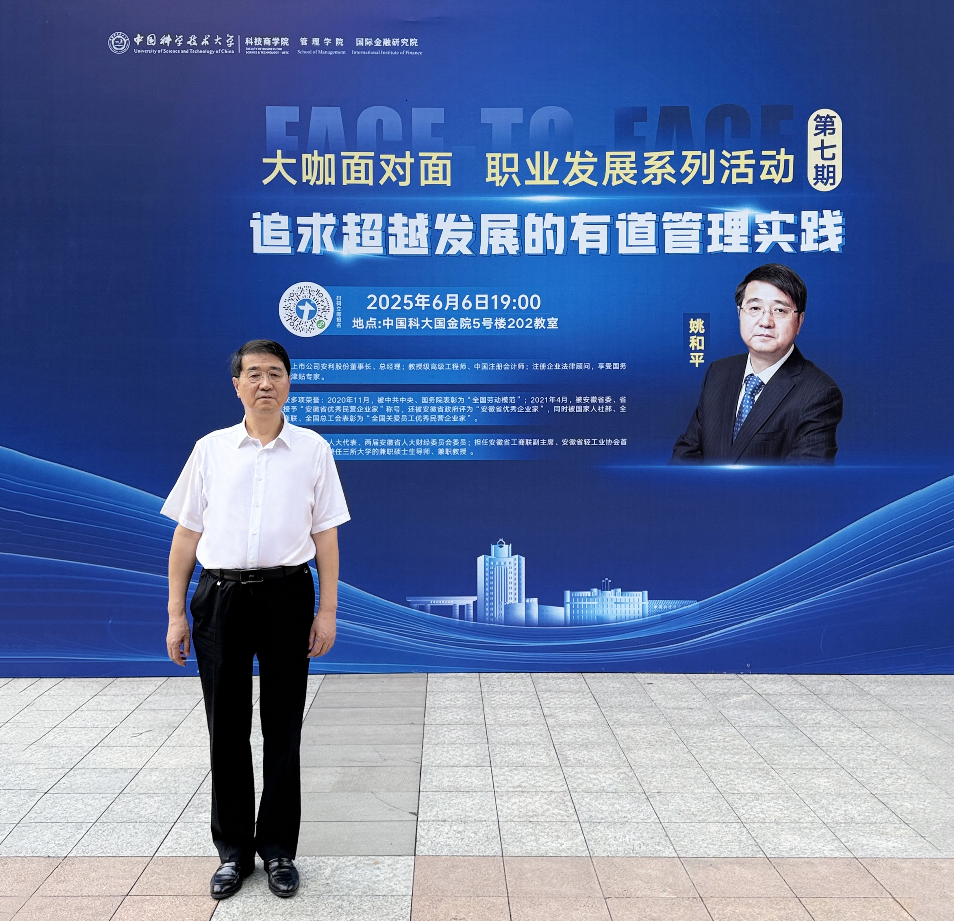 6月6日晚,中国科学技术大学国际金融研究院教室内座无虚席,在青春洋溢的氛围中,一场商界智慧与学术思想的深度碰撞精彩上演。应中国科学技术大学管理学院之邀,安利股份(300218.SZ)董事长、总经理姚和平以“追求超越发展的有道管理实践”为主题,为100余名师生带来一场别开生面的企业经营管理分享报告。值得一提的是,当天恰逢安利股份核心价值观提出25周年,这场分享报告更显得意义非凡。