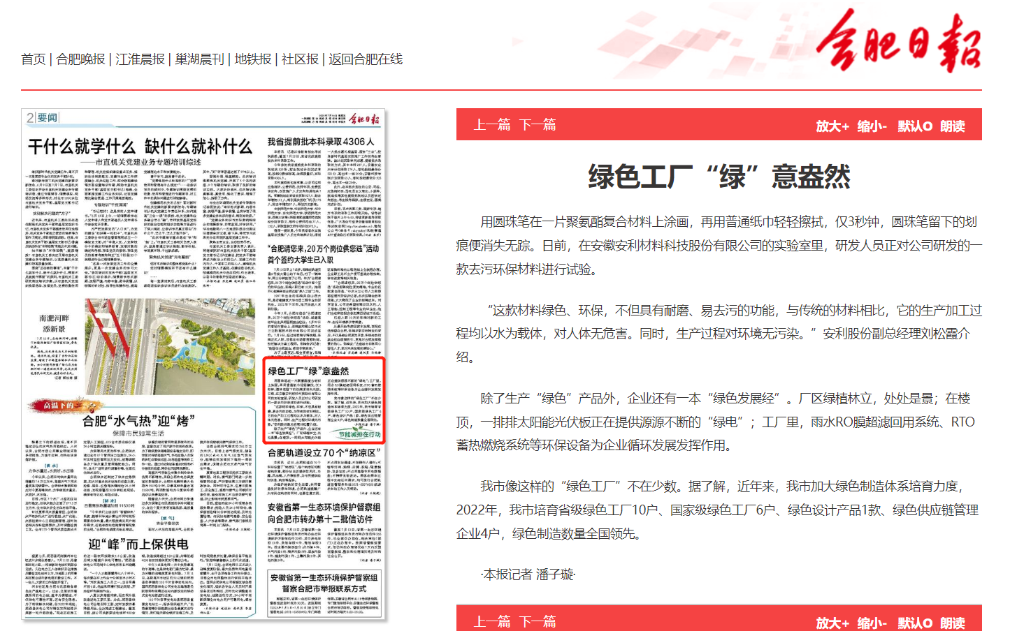 “这款材料绿色、环保,不但具有耐磨、易去污的功能,与传统的材料相比,它的生产加工过程均以水为载体,对人体无危害。同时,生产过程对环境无污染。”安利股份副总经理刘松霞介绍。